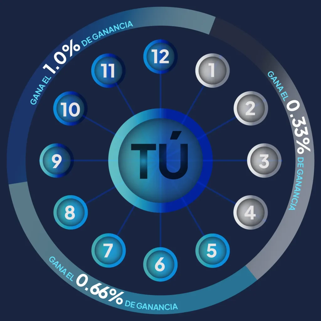 Recibe un porcentaje de ganancia por cada inversión que realicen las personas que invites, hasta el cuarto nivel de tu red.